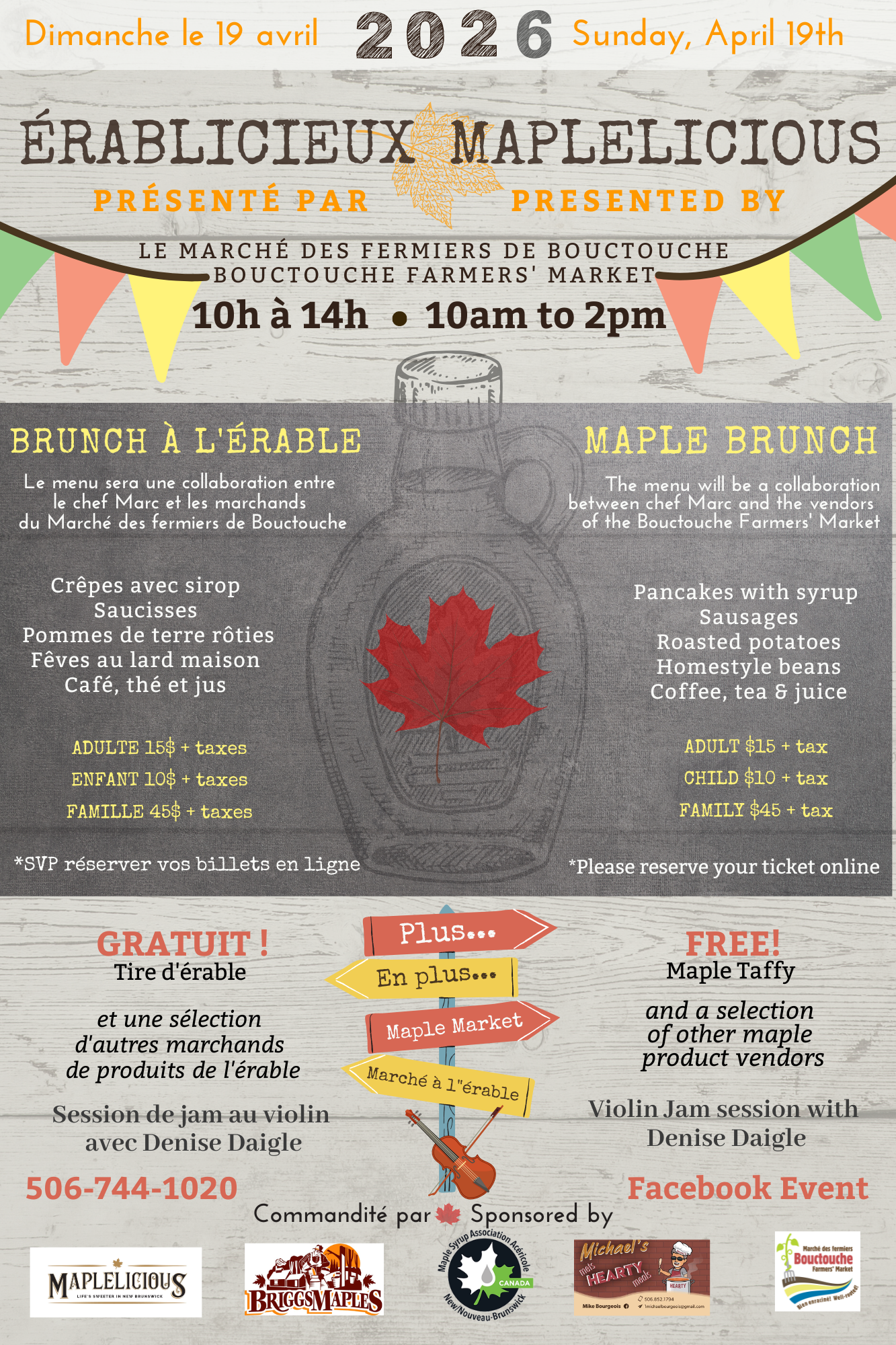 | Come and join us on Sunday, April 19th from 10am to 2pm at the Bouctouche Farmers’ Market, for a MAPLE & MUSIC MARKET and the MAPLELICIOUS FAMILY BRUNCH.