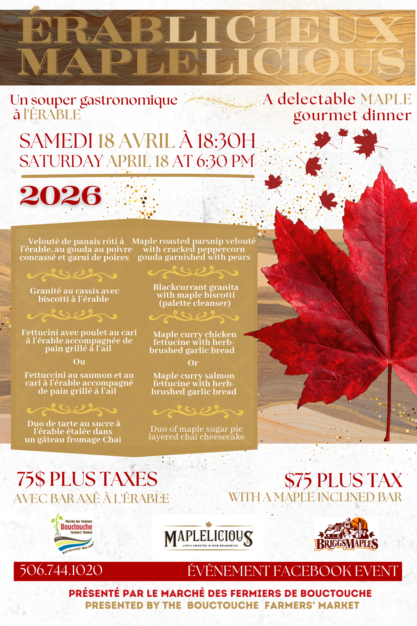 The Bouctouche Farmers’ Market is pleased to invite you to the first event of the 2026 season. This four course MAPLELICIOUS dinner will be held on Saturday April 18th, 2025, at 6:30pm.
